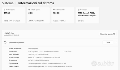 Vendo portatile LENOVO IdeaPad Slim 3 perfettamente funzionante, con le seguenti caratteristiche: -schermo 15,6" -processore AMD Ryzen 5 7520U -RAM 16 GB -disco SSD 512 GB -scheda video AMD Radeon Graphics -webcam integrata con otturatore fisico -lettore impronte digitale -porte: 2 USB A, 1 USB C, HDMI, microfono/cuffie, micro SD -Sistema operativo Windows 11 Spedisco o ritiro di persona per chi abita in zona.
