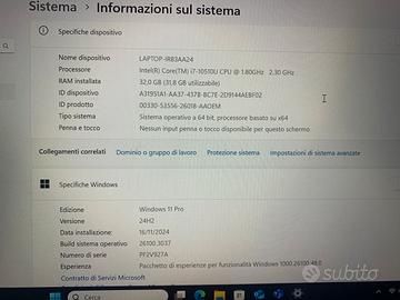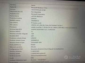 Lenovo thinkpad T14 gen1 Windows 11 pro 24H2 Intel core i7 - 10510U 2.30 GHz 32 GB RAM 1GB Intel UHD graphics SSD 475 GB 2xUSB 3.1 1x HDMI 1.4 1xSlot mobile WWAN integrata LTE-A CAT9/16 1xlettore micro SD 1x Thunderbolt 3 USB-C 1x connettore thinkpad docking station 1x slot smartcard Caricabatterie USB-C 65W