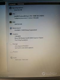 Tolgo per non utilizzo portatile sony vaio 2 GB di ram e 160gb di HHD lettore cd funziona lunica cosa ce non funziona e la batteria e la regolazione della luminosita dalla tastiera alimentatore compatibile sistema operativo Linux si puo cambiare e mettere Windows.