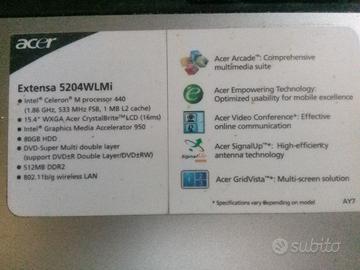 Il modello Extensa ha lo schermo (display) da riparare (attualmente risulta troppo scuro per l'utilizzo). Sono dotati entrambi di processore Intel (Pentium e Celeron), masterizzatore cd-dvd, wireless/wi-fi. La tastiera è in ottimo stato.
