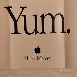 Slogan: Presenta la celebre scritta "Yum." in grassetto e il logo Apple con il payoff "Think different." nella parte inferiore.