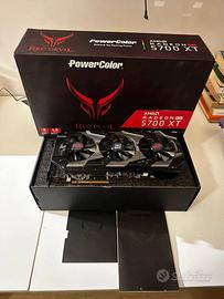 Specifiche principali: GPU: AMD Radeon RX 5700 XT Memoria: 8GB GDDR6 Interfaccia: PCIe 4.0 Versione custom Red Devil (tripla ventola, ottimo sistema di dissipazione) Scheda sempre utilizzata in PC personale, senza mai problemi di prestazioni. Perfetta per giocare a tutti i titoli come: Elden Ring Cyberpunk 2077 Call of Duty: Warzone Temperature e prestazioni sempre ottimali. Nessun difetto tecnico o estetico. incluso: Scatola originale Accessori originali Manualistica Ho personalmente effettuato il cambio di pasta termica applicando MX-4 + Pad termici nuovi. Il dissipatore con le tre ventole non sono MAI STATI USATI, poiché il mio pc montava raffreddamento a liquido.