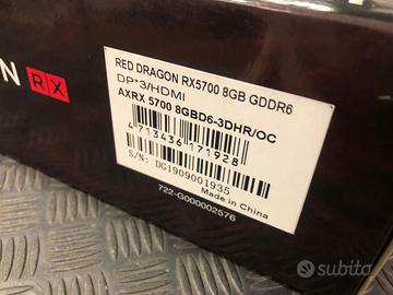 PowerColor Red Dragon Radeon RX 5700, completa di confezione originale. --------------------------------------------- Specifiche Tecniche: GPU: AMD Radeon RX 5700 Memoria: 8GB GDDR6 Interfaccia memoria: 256-bit Bus: PCI Express 4.0 Architettura: RDNA Supporto DirectX 12 --------------------------------------------- Connettività: 3x DisplayPort 1x HDMI --------------------------------------------- Sistema di raffreddamento: Dissipatore a doppio slot Doppia ventola --------------------------------------------- Dimensioni: Lunghezza: 240 mm Altezza: 132 mm Spessore: 41 mm Formato: Dual Slot --------------------------------------------- Condizioni: Usata Scatola originale inclusa Nessun accessorio aggiuntivo --------------------------------------------- Spedizione e consegna: Spedizione con imballaggio accurato
