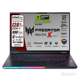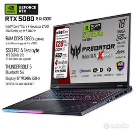 Acer Predator Helios 18 AI Portatile Gaming, Processore Intel Ultra 9-275X, 24 core fino a 5,4 GHz | RAM 128 GB DDR5 | 4 TB SSD (2x2TB) Display 18" WQXGA IPS 250Hz MINILED, GeForce RTX 5080 16Gb GDDR7, WI-FI 7, Win 11 Pro Ready Processore : Intel Ultra 9 275X - Tetracosa-core (24 Core) | 36 MB | Fino a 5,4 Ghz in Modalità Burst Mode Display : WQXGA IPS SlimBezel | Diagonale 18" | Refresh Rate 250 Hz Risoluzione : 2560 x 1600 - 2.5K | Formato : 16:10 | Tempo di risposta : 3ms Memoria RAM : 128 GB | DDR5 5600 MHz Tipo di archiviazione | Dual SSD : 2 x SSD M.2 PCIe NVMe 2 TB Totale archiviazione : 4 TB ⁓ 2000 GB Scheda Video : GeForce RTX 5080 16 GB GDDR7 Focus sul display | 18" WQXGA IPS SlimBazel Godi di una realtà immersiva senza precedenti sfruttando l'enormità di questo pannello. Tempo di risposta minore di 3ms - Gamma di colori DCI-P3 al 100% - Formato : 16:10 - luminosità di picco di 1000 nit Refresh Rate 250Hz | Display incomparabile Scopri l'esperienza di gioco fluida e reattiva con il nostro notebook dotato di display da 250Hz, per immagini nitide e azioni seamless. Perfetto per professionisti e appassionati che cercano prestazioni e qualità visiva senza compromessi. VISITA IL NOSTRO STORE MULTIMEDIASHOPPING