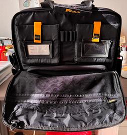 Borsa porta laptop e documenti in buone condizioni. Tre scomparti Due tasche esterne. Manico e spallaccio. Diverse tasche interne. Alloggia laptop fino a 15 pollici (37 cm). Dimensioni esterne: larghezza 44 cm; altezza 37 cm; profondità 12 cm.