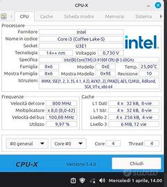 CPU Intel Core i3-9100F (9a Gen) – 4.2GHz Turbo – Compatibile Windows 11 Vendo processore Intel Core i3-9100F (nona generazione Coffee Lake), perfettamente funzionante e testato con successo, come dimostrato dagli screenshot di CPU-X allegati. È una CPU eccellente per chi vuole assemblare un PC economico ma scattante per l'ufficio, lo studio o il gaming leggero. Grazie alla sua architettura, supporta ufficialmente Windows 11 senza alcuna modifica. Specifiche Tecniche: Core / Thread: 4 Core / 4 Thread. Frequenza: Base 3.60 GHz / Turbo Boost fino a 4.20 GHz. Socket: LGA 1151 (Serie 300: H310, B360, B365, Z370, Z390). Consumi: Molto efficiente (TDP 65W). IMPORTANTE: Trattandosi del modello "F", questa CPU richiede l'utilizzo di una scheda video dedicata (Nvidia/AMD) per funzionare, poiché non dispone di chip grafico integrato. Condizioni: Processore smontato da workstation funzionante, temperature ottime (25°C in idle come da screenshot). Pins e contatti integri. È perfetto per chi ha un vecchio PC con un processore Celeron o Pentium di 8ª o 9ª generazione e vuole fare un salto di qualità spendendo pochissimo, garantendosi la compatibilità con Windows 11. Disponibile per consegna a mano in zona o spedizione tramite TuttoSubito.