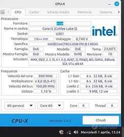 Vendo processore Intel Core i5-8500 perfettamente funzionante e testato, come visibile dagli screenshot di CPU-X allegati. Si tratta di una CPU solida e affidabile, ottima per PC da ufficio, media center (HTPC) o PC da gaming entry-level. Essendo un processore di ottava generazione, è pienamente compatibile con Windows 11 senza bisogno di bypass o modifiche. Caratteristiche Principali: Core / Thread: 6 Core fisici / 6 Thread. Frequenza: Base 3.00 GHz / Turbo Boost fino a 4.10 GHz. Socket: LGA 1151 (compatibile con schede madri serie 300, es. H310, B360, B365, Z370, Z390). Grafica Integrata: Intel UHD 630 (funziona anche senza scheda video dedicata). TDP: Solo 65W (scalda pochissimo e consuma poco). Condizioni: La CPU è stata tenuta con cura, mai sforzata e pulita regolarmente. Le temperature sono eccellenti (circa 23°C come da test). Viene venduta per passaggio a categoria superiore. Scambio a mano in zona o spedizione veloce con TuttoSubito.