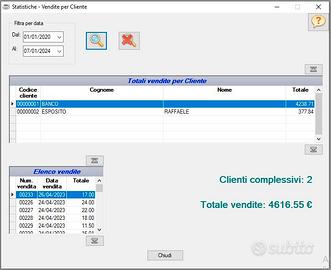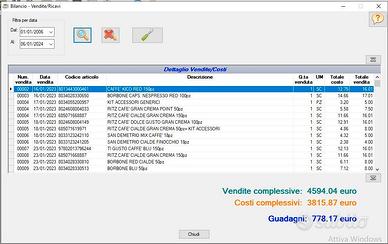 Molto semplice, intuitivo e pratico da usare e che non richiede competenze di ragioneria o commerciali. Potrete finalmente sfruttare i vantaggi che offre un PC o un portatile (l'importante è che abbia Windows) per le vostre vendite al banco in modo da recuperare velocemente il prezzo di vendita e le giacenze della merce ed i Vs. clienti in archivio. Si può utilizzare anche un lettore di codice a barre per facilitare tutte le operazioni. Il controllo del magazzino vi permetterà di gestire il carico/scarico merce, il tracciamento delle vendite ai clienti e la verifica delle scorte minime. Avrete in ogni momento la possibilità di verificare l'andamento delle vostre vendite con calcolo automatico dei costi e dei guadagni. Potete richiedere, senza nessun impegno, una versione dimostrativa che vi verrà inviata via mail per valutare il programma e decidere con calma se acquistarlo. Una volta venduto vi verrà inviata (sempre via mail) una chiave di attivazione per poter utilizzare appieno il software. Non esitate a contattarmi per qualunque info - disponibile per spiegare da vicino l'utilizzo ed il funzionamento del programma).