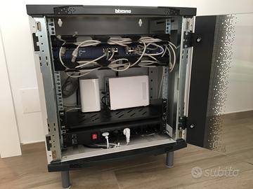Armadio rack BTicino 19” 12U da pavimento con piedini, struttura compatta ed elegante ideale per rete domestica avanzata o piccolo ufficio, dotato di porta frontale in vetro fumé con chiusura a chiave e predisposizione per ventilazione superiore, usato pochissimo per pochi mesi e in ottime condizioni, vendo esclusivamente per trasloco, incluso nel prezzo patch panel con cavi di rete completi di connettori RJ45 pronti all’uso, soluzione perfetta per organizzare impianti fibra, NAS, domotica o sistemi di rete in modo ordinato e professionale senza necessità di ulteriori interventi, ottimo rapporto qualità/prezzo rispetto al nuovo, disponibile per visione e ritiro.