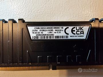 Memorie RAM CORSAIR Vengeance LPX - DDR4 3600MHz - C18 - 2x16GB - Serie: Venegeance LPX - Modello: CMK32GX4M2D3600C18 - Capacità: 32GB (2x16GB) - Configurazione per modulo: Dual Rank 2Rx8 - In perfetto stato - Ricevuta d'acquisto Amazon.it per la gestione della garanzia a vita Corsair - Velocità testata: 3600MT/s (XMP 2.0) - Latenza testata: 18-22-22-42 - Voltaggio testato: 1.35V - Unbuffered - Non-ECC - Intel XMP 2.0 (Extreme Memory Profile) Ready Testate e verificate su PC Ryzen 5000 e chipset AMD X570 con un'ora di OCCT Stability Test.