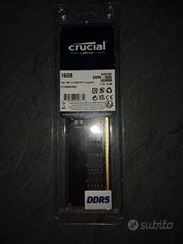 RAM Crucial 16GB DDR5-5600 UDIMM (Nuova) Vendo modulo di memoria RAM Crucial da 16GB DDR5, ideale per PC desktop di ultima generazione. La memoria è nuova, ancora nella sua confezione originale sigillata. Specifiche Tecniche: Capacità: 16GB Tecnologia: DDR5 Velocità: 5600 MT/s (PC5-44800) Formato: UDIMM (per Desktop) Latenza CAS: CL46 Voltaggio: 1.1V Compatibilità: Supporta sia Intel XMP 3.0 che AMD EXPO per un'ottimizzazione facile e veloce.