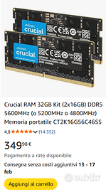 Vendo kit di memoria RAM Crucial by Micron DDR5 da 32GB (2x16GB) per notebook. NUOVE NUOVE NUOVE NUOVE NUOVE NUOVE NUOVE - guardate amazon a quanto le vende e gli altri negozi online! SI VOCIFERA CHE AUMENTERANNO ANCORA! Prodotto nuovo, mai utilizzato, ancora nella confezione originale. Specifiche tecniche: Marca: Crucial (Micron) Capacità totale: 32GB (2 moduli da 16GB) Tipo: DDR5 SODIMM (per notebook) Frequenza: 5600 MHz Latenza: CL46 Voltaggio: 1.1V Modello: CT2K16G56C46S5 Compatibilità: Adatte a notebook di ultima generazione che supportano DDR5 SODIMM 5600MHz (Intel e AMD). Consiglio comunque di verificare la compatibilità con il proprio modello. Condizioni: Nuove Mai montate Confezione originale