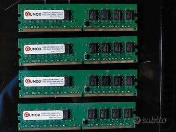 RAM DDR2 8GB (4x2GB) 800MHz PC2-6400 – Perfette e Testate Vendo 4 banchi di memoria RAM marca QUMOX: • 2GB ciascuno • DDR2 800MHz (PC2-6400) • 240 pin (per PC desktop) Perfettamente funzionanti, smontati da PC funzionante. Ideali per aggiornare o riparare computer più datati. Vendita in blocco. 💰 Prezzo: 30€ trattabili 📍 Consegna con spedizione Subito