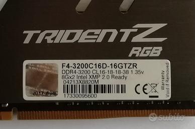Kit memoria RAM G.Skill Trident Z RGB DDR4 3200MHz 16GB (2x8GB), modello F4-3200C16D-16GTZR, composto da 2 moduli da 8GB per un totale di 16GB. Supportano profilo XMP 2.0. Dissipatore in alluminio e RGB. Sono perfettamente funzionanti. Non ho la scatola ma saranno adeguatamente imballate.