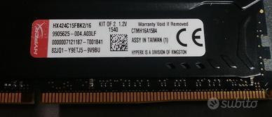 Due banchi di ram ddr4 Kingston Fury da 8 gb ciascuno. Modello HX424C15F8K2/16 Frequenza 2400 mhz Cache latency 15