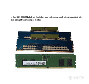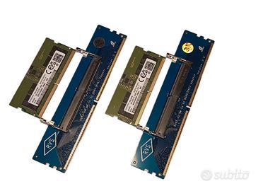 Samsung RAM DDR5 SODIMM 16GB 5600MHz KIT(2x8Gb) con Scheda Adattatore RAM DDR5 UDIMM RAM perfettamente funzionanti, testate anche con 3DMark. Queste 16Gb (2x8) di RAM DDR5 da 5600mhz per portatili con l'adattatore da SODIMM a UDIMM funzionano perfettamente in tutti i giochi, mantenendo performance elevate e garantendo la massima efficienza (testate). Dalle immagini del bios si vedono le RAM che vengono riconosciute subito nel pc desktop. La RAM DDR5 5600 MHz è retrocompatibile con i sistemi che supportano velocità inferiori (come 5200 MHz o 4800 MHz), rendendola un'ottima scelta per la maggior parte dei laptop DDR5 moderni. Con 2 banchi di RAM si sfrutta al meglio il Dual Channel consentendo l'elaborazione parallela dei dati, in quanto i controller di memoria possono accedere ai dati da entrambi i moduli contemporaneamente aumentando le prestazioni. Questi moduli di memoria prodotti da SAMSUNG sono affidabili e di lunga durata, coperti da una garanzia a vita dal produttore. Ha un fattore di forma SODIMM e presenta una tecnologia non ECC, rendendoli un'ottima scelta per migliorare la velocità e l'efficienza delle prestazioni del tuo computer. Ottima soluzione per questo periodo di crisi: RAM DDR5 a prezzi esagerati. Caratteristiche Principali: Capacità Totale: 16GB (2x8GB) Tipo: DDR5 SO-DIMM (Formato piccolo per notebook o grande per desktop con l'adattatore) Velocità: 5600MHz (PC5-44800) Voltaggio: 1.1V Marca: SAMSUNG Condizione: Perfettamente funzionanti, pari al nuovo. Codice Prodotto PN:M425R1GB4BB0-CWMOD Kit : 2 X 8 Scheda Adattatore convertitore RAM DDR5 per Laptop da SODIMM DDR5 a DIMM per Desktop Compatibile con tutti i laptop con chipset Intel di 12a, 13a e 14a generazione e processori AMD Ryzen serie 6000,7000 e 9000 che supportano lo standard DDR5