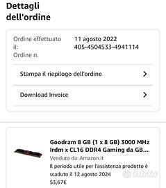 Vendo per causa inutilizzo RAM da 8 GB aquistata il 22 Agosto 2024 Marca: GOODRAM (modello IRDM) •Capacità: 8 GB •Tipo: DDR4 •Velocità: 2400 MHz (PC4-19200) •Modello: IR-G2400D464L15S/8G •Formato: DIMM (desktop)