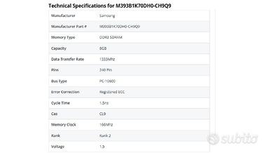 Vendo RAM solo per macchine Server marca Samsung e Hynix DDR3-10600 1333 ECC perfettamente funzionanti da 8GB 2Rx8. Kit da 4 pezzi. Contatto tel. 3756686663 preferibilmente solo whatsapp o email. No sms.