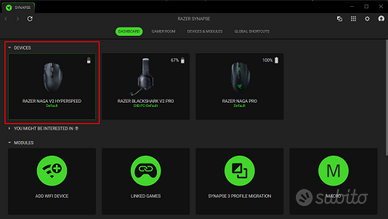 Mouse in condizioni eccellenti, perfettamente funzionante. Completa di tutta la dotazione con scatola. L’adesivo inferiore è stato rimosso perché aveva iniziato a staccarsi e dava fastidio. Motivo della vendita: passaggio a Naga Pro. Disponibili qualsiasi verifica, test e foto aggiuntive. Possibile incontro di persona nella zona Bicocca (Milano).