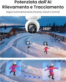 【Rilevamento Intelligente + Tracciamento Automatico】 Grazie all’IA, la telecamera con SIM rileva persone, veicoli e animali riducendo i falsi allarmi. La funzione PTZ 360° con auto tracking segue i soggetti in movimento, rendendola una telecamera esterno completa per la sicurezza.