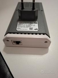 Ripetitore WLAN FRITZ!Box 1750E per estendere la copertura della rete wireless. - Colore bianco e rosso. - Pulsante WPS per una connessione rapida. - Indicatori LED per Power, WLAN e LAN.