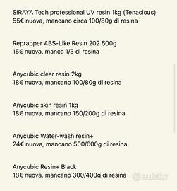 Salve, mi sono dovuto liberare dell mia stampante a resina per il troppo poco spazio disponibile, purtroppo rimangono queste bottiglie di resine varie comprate nel tempo, se qualcuno fosse interessato mi contati pure, preferibile vendita in blocco, prezzi in foto sono indicativi per il valore delle bottiglie, prezzo trattabile