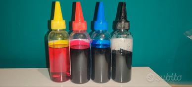 Vendesi 4 boccette di inchiostri Giallo, Ciano, Magenta, Nero da 100 ml ciascuna.