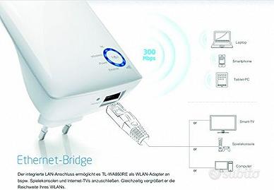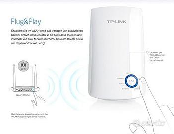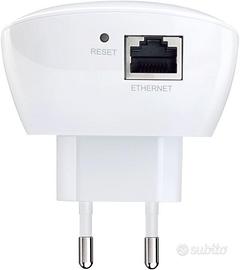Ripetitore Wi-Fi (Range Extender) TP-Link TL-WA859RE in condizioni ottime, completo di scatola originale e alimentatore. Questo dispositivo è ideale per estendere il segnale Wi-Fi in ambienti domestici o piccoli uffici dove la copertura del router principale è debole o irregolare. Supporta la banda 2.4 GHz, standard IEEE 802.11b/g/n, con velocità fino a 300 Mbps. È perfetto per uso generico di internet, navigazione web, smartphone, TV smart con esigenze tipiche di streaming SD/HD leggero e dispositivi IoT. Caratteristiche principali 🔹 Modello: TP-Link TL-WA859RE 🔹 Standard Wi-Fi: 802.11b/g/n (2.4 GHz) 🔹 Velocità: fino a 300 Mbps 🔹 Modalità ripetitore (range extender) 🔹 Tasto WPS per connessione rapida 🔹 LED intelligenti per qualità del segnale 🔹 Installazione semplice e immediata con e senza App 🔹 Compatibile con qualsiasi router Wi-Fi 🔹 Design compatto da presa elettrica Cosa include ✔ TL-WA859RE ✔ Scatola originale ✔ Manuale / Quick Start Guide Stato e funzionamento Il ripetitore è perfettamente funzionante, senza difetti. Testato e funzionante con rete Wi-Fi domestica; emette il segnale esteso come previsto. Non è più utilizzato perché ho aggiornato la copertura con un sistema domotico.