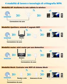 【Modalità di funzionamento multiplo】 Modalità operative multiple Supporta le modalità Repeater/AP/Router/Mesh. Il nuovo access point WIFI può essere adattato in modo flessibile ai vari requisiti di rete in ambienti diversi.La modalità AX3000 Repeater estende la copertura Wi-Fi e migliora la connettività con facilità.La modalità AP è adatta agli utenti che devono estendere la copertura di rete.