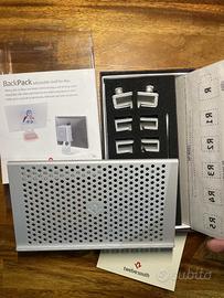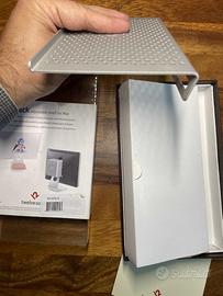 Ripiano sottile e resistente, pensato per iMac, Cinema Display Apple e monitor similari. Questa lastra di metallo funge da appoggio per dischi rigidi e periferiche USB.