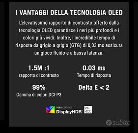 Vendo il ROG Swift Monitor PG27AQDP OLED 480hz 0,03ms per Gaming e/o Competitivo in condizioni perfette e pari al nuovo a 700€. Descrizione ufficiale: "Rimanete al passo con i tempi con il ROG Swift OLED PG27AQDP, il primo monitor OLED al mondo a 1440p 480 Hz. Progettato per gli esports e per i più recenti titoli AAA ricchi di azione, questo monitor da gioco QHD da 27 pollici è caratterizzato da una frequenza di aggiornamento di 480 Hz per una grafica incredibilmente fluida e da tempi di risposta fulminei di 0,03 ms. Il pannello OLED offre una copertura DCI-P3 del 99%, garantendo una nitidezza d'immagine senza pari e colori vivaci. Inoltre, il nuovo ROG AI Assistant è progettato per migliorare le esperienze di gioco. Per garantire la longevità del monitor, il nuovo software OLED Care+ offre una serie di funzioni per salvaguardare il pannello OLED e un avanzato dissipatore personalizzato fornisce un eccezionale raffreddamento passivo per ridurre il rischio di burn-in." Ritiro a mano a latina città, prezzo non trattabile, il monitor ha qualche mese di vita