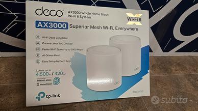 Vendo Sistema Wifi 6 TPlink serie Deco. Composto da un Router 4G+ AX3000 e da due wifi extender di tipo mesh wifi 6 sempre della serie Ax3000. Il router è ideale per connessioni fibra ottica, Adsl oppure funziona anche con Sim di qualsiasi operatore (alte prestazioni di ricezione e ottima copertura wifi). I due extender sono della stessa serie Deco e offrono l'opportunità di estendere la rete wifi sia via onde wirless opporre mediante cavi di rete ethernet. Ideale per case o attività di grandi dimensioni anche su piani differenti.Per i dettagli e le schede tecniche dei prodotti consultare il sito Tplink Deco. Gli articoli sono pari al nuovo (solo usati come demo in 2 fiere). Costo dell'intero kit 200€. Solo ritiro di persona.
