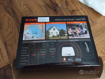Vendo router **Tenda N300 Wi-Fi 4G LTE**, perfettamente funzionante e in ottime condizioni. Il router è completo di **scatola originale e istruzioni**. Ideale per avere internet in casa, in ufficio, in una seconda casa o dove non arriva la linea fissa: basta inserire una **SIM dati 4G** e si collega subito alla rete. Caratteristiche: * Wi-Fi N300 * Supporto **SIM 4G LTE** * Porte LAN per collegamento via cavo * Facile configurazione Vendo per inutilizzo. Per qualsiasi informazione scrivetemi pure.