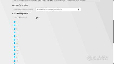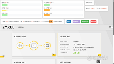Router 5g 4G Zyxel NR5103 nobrand ZyXEL NR5103 5G 4G NR Router per interni 2xRJ45 2.5G 1xUSB 3.0 4 porte TS9 per antenna esterna Velocità del router 5G NR ZyXEL Sub-6Ghz fino a 4,67 Gbps/2,5 Gbps (DL/UL) in modalità NSA e SA, wifi 6, selezione bande per 4g e 5g, funziona con tutte le sim. Connettività WiFi condivisa 2,4/5 Ghz, fino a 64 dispositivi,2 porte lan da 2,5 gigabit, una porta usb 3.0 Il router NR5103 del produttore ZyXEL è in grado di garantire velocità 5G fino a 4,67 Gbps in download, è dotato di tecnologia WiFi6. Ha il vantaggio di integrare 4 connettori TS9 per il collegamento di un'antenna esterna per potenziare il segnale 4G/5G. Ventola interna – Raffreddamento attivo: zero rallentamenti anche con uso intenso. Chip MediaTek T750 – Prestazioni affidabili, consumi ottimizzati, lunga durata. Firmware già aggiornato no brand, con interfaccia originale Zyxel. Selezione bande Nativa. Uno dei pochi router con 4 connettori per antenne esterne, guardate le recensioni su youtube, considerato uno dei migliori router da interno. Usato poco, in ottime condizioni, router completo di alimentatore. Hack informativo funzionante. Schermata con speedtest bts distante, 2km circa. Funziona meglio di zte mc 888 ultra Se siete vicini lo provate con una vostra sim.