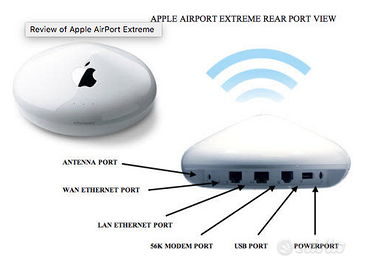 Il router AirPort Extreme di Apple, noto per il suo design a forma di disco volante, è un dispositivo wireless di alta qualità progettato per offrire connettività Wi-Fi stabile e veloce. Le dimensioni della versione a forma di disco volante sono circa 165 mm di lunghezza e larghezza e 34 mm di altezza, con un peso di circa 753 grammi (modello 4a generazione).