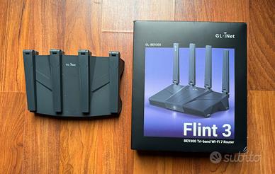 GL.iNet Flint 3 (GL-BE9300) Router per fibra FTTH, tri-band Wi-Fi 7 ad alte prestazioni, ideale per uso domestico e piccoli uffici, caratterizzato da velocità fino a 9.300 Mbps, processore Qualcomm quad-core da 1.5GHz, 1GB di RAM e 5 porte 2.5G Ethernet, con supporto avanzato per VPN. Perfetto usato pochissimo, completo di scatola alimentatore e cavi.