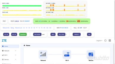 Router Modem ZTE G5B1 5G 4G, Top di gamma, ideale per Gaming streaming, NOBRAND, con due porte ethernet. WIFI 6, ha una porta telefonica che funziona sia per telefonare che per ricevere. Successore dello zte mc888 ultra, antenne molto sensibili, uno dei migliori. Supporta tutte le SIM Wind, Vodafone, TIM, Iliad, Poste ecc., Apn Automatico o manuale. Router Nuovo, solo provato, completo di scatola alimentatore e cavo ethernet. Menu in lingua inglese francese spagnolo ecc. Funziona l’hack aggiornato, per abilitare selezione bande e cell lock, utile se avete bts scarse e ne volete scegliere una in particolare. Con Windtre e Very aggrega anche N38 e N78 ( provato su bts lontane ). Puoi avere l’accesso al menu nascosto Developer Options per selezione bande e blocco Celle (modalità Sviluppatore). Preferibile la consegna a mano, ma posso spedire