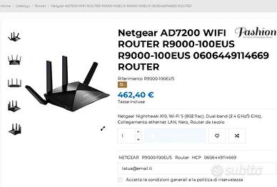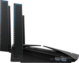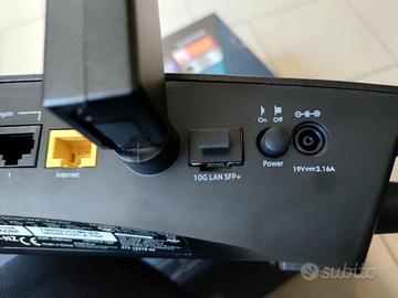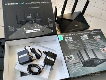 Router, Access point, Repeater, Extender Top di Gamma! Il router più veloce del settore per lo streaming multimediale con Plex Media Server Completo di scatola originale e alimentatori. Assicuro spedizione a prova di corriere sbadato. Disponibile anche la consegna a mano. Netgear R9000 Nighthawk X10 Smart Router WiFi, Tri-band AD7200 (7.2 Gbps), Streaming Video 4K Ottimizzato, Gestione da Smartphone e Tablet, Funziona con Alexa Nighthawk X10 con tecnologia WiFi 802.11ac e 802.11ad offre uno streaming 4K e gaming VR ultra fluidi, oltre a download istantanei. Con il potente processore quad-core da 1,7 GHz e l'architettura Quad-Stream, è possibile godere di velocità wireless combinate fino a 7,2 Gbps. La funzionalità MU-MIMO supporta lo streaming simultaneo, mentre il supporto a 160 MHz raddoppia le velocità WiFi per i dispositivi mobili. Quattro antenne attive esterne amplificano il segnale WiFi per massimizzare la copertura e il throughput. Prestazioni WiFi veloce: copertura wireless fino a 230 m² con velocità AD7200 (tri-band fino a 800 + 1733 + 4600 Mbps per dispositivi con banda da 60 GHz) Consigliato per un massimo di 45 dispositivi: è possibile riprodurre video in streaming, giocare, navigare su Internet e collegare i dispositivi domestici intelligenti Porte ethernet cablate: è possibile collegare computer, console di gioco, lettori di streaming e altri dispositivi cablati nelle vicinanze con 6 porte 1 gigabit Ethernet e 1 porta SFP+ da 10G Caricato con tecnologia: progettato con un processore quad-core da 1.7 GHz, 4 antenne amplificate, Beamforming+, MU-MIMO, Dynamic QoS, comandi vocali Amazon Alexa e altro ancora Condividi un'unità di archiviazione e una stampante con qualsiasi dispositivo connesso, e di creare un'archiviazione cloud personale per l'accesso da qualsiasi luogo, utilizzando le 2 porte USB 3.0 Parental control intelligente: l'app Nighthawk consente di gestire l'accesso dei dispositivi Visiona i miei articoli, possibiltà di sconti cumulativi😊