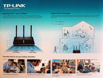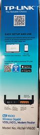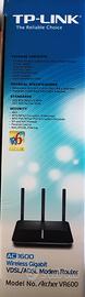 TP-Link Archer VR600 in ottimo stato completo di scatola con tutto il contenuto presente all'acquisto. Trattasi di Modem Router ADSL/VDSL(Fibra) AC1600, Wi-Fi Dual Band 1.6 GB 300Mbps (2,4GHz) e 1300 Mps (5GHz), Supporto 3G/4G, 4 Porte Gigabit, 2 USB 2.0, CPU Broadcom, Smartphone App Tether (Android, iOS) e tre antenne