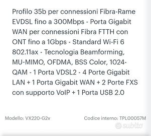 Profilo 35b per connessioni Fibra-Rame EVDSL fino a 300Mbps - Porta Gigabit WAN per connessioni Fibra FTTH con ONT fino a 1Gbps - Standard Wi-Fi 6 802.11ax - Tecnologia Beamforming, MU-MIMO, OFDMA, BSS Color, 1024-QAM - 1 Porta VDSL2 - 4 Porte Gigabit LAN + 1 Porta Gigabit WAN + 2 Porte FXS con supporto VoIP + 1 Porta USB 2.0