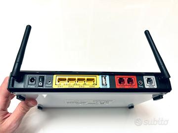 Router wifi con doppia antenna, condizioni buone, con alimentatore, cd di installazione e istruzioni. Condizioni buone, l’etichetta con il marchio centrale è leggermente rovinata (vedi foto, difetto solamente estetico). Consegna di persona a Mestre o dintorni, oppure disponibile spedizione.