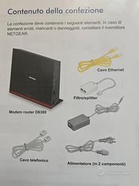 Contenuto confezione: D6300 Wi-Fi modem router, cavo Ethernet, cavo telefonico, filtro ADSL2+, guida d’installazione, alimentatore