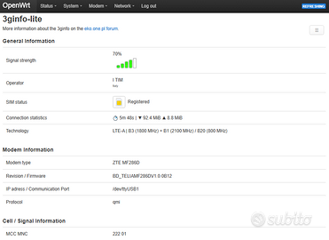 Vendo ZTE MF286D 4G/LTE cat 12 con OpenWrt 24.10.5 (latest release) con alimentatore e cavo Ethernet.