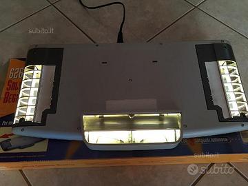 E' dotato infatti, oltre che di una lampada centrale, di due luci laterali estraibili e regolabili a secondo delle dimensioni del monitor.