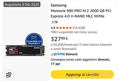 Vendo SSD Samsung 990 PRO da 2TB, formato M.2 NVMe PCIe 4.0 Condizioni: pari al nuovo, perfettamente funzionante Acquistato a febbraio 2025 Ideale per gaming, editing video e utilizzo professionale Compatibile con PC desktop e laptop con slot M.2 NVMe Perfetto per chi vuole prestazioni al top e tempi di caricamento praticamente istantanei. Prezzo poco trattabile! 📦 Confezione completa (SSD + scatola + manuali) 📍 Consegna a mano / spedizione disponibile Non esitate a contattarmi per qualsiasi informazione aggiuntiva o foto.