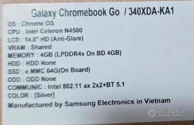 vendo per inutilizzo samsung chrome book modello come da titolo, compresa confezione e caricatore originale. per le caratteristiche vedere il sito del costruttore inserendo il codice articolo xe340xda-ka1it