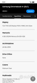 Vendo per inutilizzo Samsung Chromebook 4+ 15 pollici acquistato 3 anni fa in ottime condizioni come nuovo. Per info 3240854862