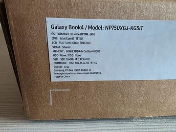 Samsung Galaxy Book4 modello NP750XGJ-KG5IT, NUOVO, mai utilizzato, ancora nella sua confezione originale , aperta solo per le foto. Notebook sottile e leggero, display FHD antiriflesso da 15.6”. Specifiche tecniche: • Processore: Intel Core i3-1315U (12a gen.) • Display: 15,6” FHD Anti-Glare (1920 x 1080) • RAM: 8 GB LPDDR4x (On board) • SSD: 256 GB (M.2 PCIe 4.0) • Scheda grafica: Integrata (shared memory) • Wi-Fi: Intel 802.11ax (Wi-Fi 6) • Bluetooth: 5.2 • Sistema operativo: Windows 11 Home Incluso nella confezione: • Laptop • Caricabatterie originale • Manuale breve • Scatola originale