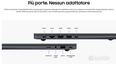 Per doppio regalo, vendo ancora in scatola sigillata proveniente da Samsung Shop Italia: Notebook Samsung Galaxy Book4 15.6" Modello: NP750XGJ-KG5IT OS: Windows 11 Home (W11M_6PF) CPU: Intel Core i3-1315U LCD: 15.6 Anti-Gre ,FHD 2nd (1920 x 1080), Anti-Glare VRAM:Shared MEMORY 8GB (LPDDR4x On Board 8GB) HDD: None ODD: None SSD 256GB (M.2,PCIe4.0) COMMUNIC: Bluetooth v5.2, Wi-Fi 6 (Gig+), 802.11 ax 2x2, Gigabit Ethernet[10/100/1000] Port: 1 HDMI, 2 USBType-C, 2 USB3.2, MicroSD Multi-media Card Reader, 1 Headphone out/Mic-inCombo, 1 RJ45 (LAN) Audio/Cam: StereoSpeakers ( 2 W x 2 ) Dolby Atmos® , Internal Dual Array Digital Mic, 720p HDCamera COLOR Gray