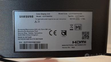 Samsung C27F390FHU – Monitor Curvo 27” Full HD, VA, 75Hz, FreeSync Vendo monitor curvo Samsung C27F390FHU in ottime condizioni. Schermo da 27 pollici con pannello VA Full HD (1920×1080) e curvatura 1800R che avvolge il campo visivo per un’esperienza più immersiva, sia per lavoro che per gaming. Punti di forza: ∙Pannello VA con contrasto 3.000:1 — neri profondi e colori vividi ∙AMD FreeSync (48–75 Hz) — niente tearing nei giochi ∙Flicker Free + Eye Saver Mode — ideale per lunghe sessioni ∙Angoli di visione 178°/178° ∙Connessioni: HDMI + VGA (D-Sub) ∙Compatibile VESA per mount a parete ✅ Il monitor è stato utilizzato pochissimo e con cura. È in perfette condizioni, pari al nuovo. È stato testato prima della vendita, funziona perfettamente e non presenta difetti allo schermo. Viene fornito di trasofrmatore e cavo HDMI originali anch’essi in perfette condizioni. Prezzo: € 150 — trattabile Zona: Varese / Como con possibile spedizione concordata